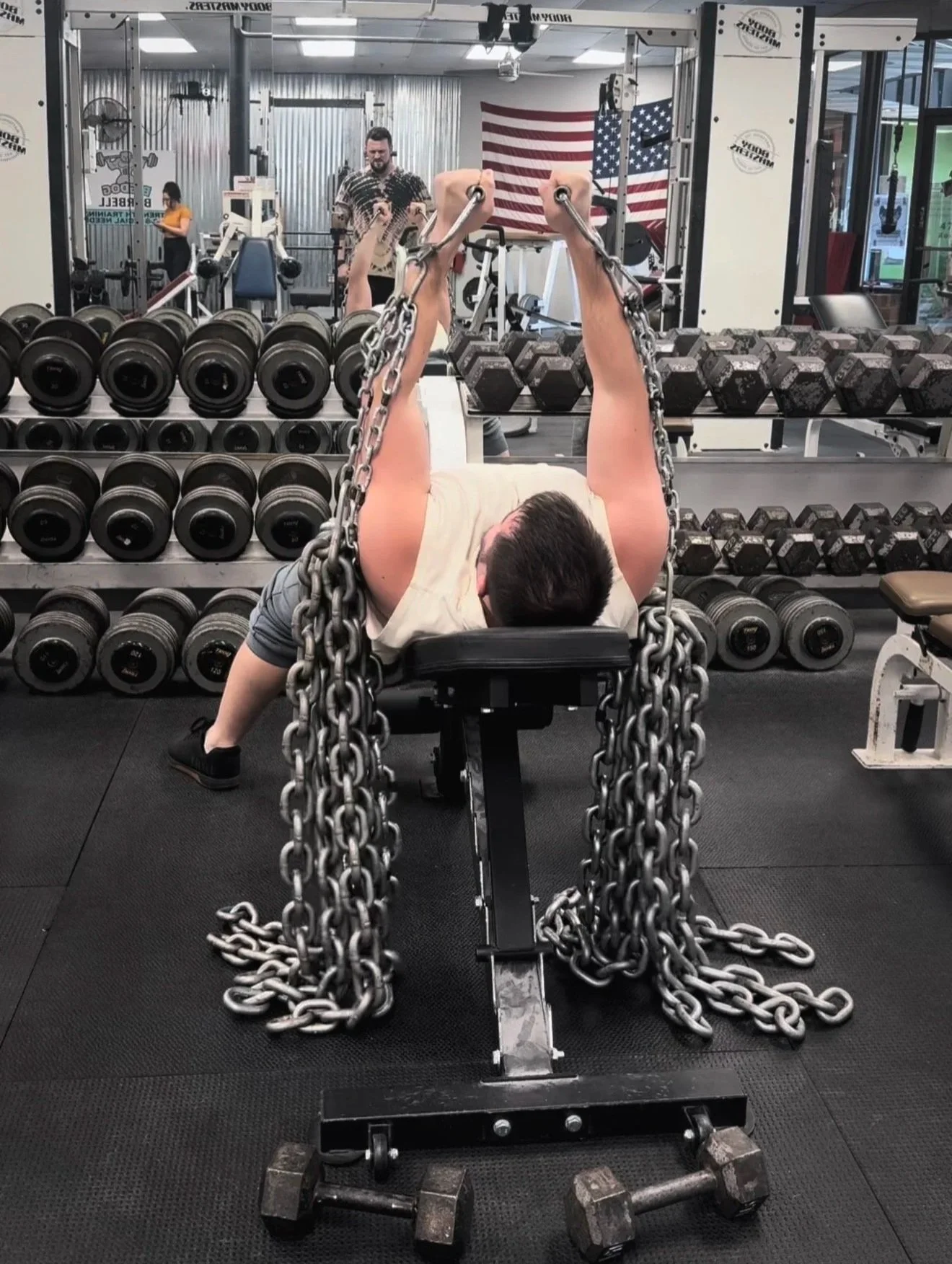 Two men standing in front of an American flag inside a gym, smiling at the camera.